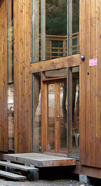 La envolvente (paredes, techos, entrepisos y aberturas) fue preconstruida totalmente en estructura de madera y montada en obra sobre pilotes de hormigón premoldeados.