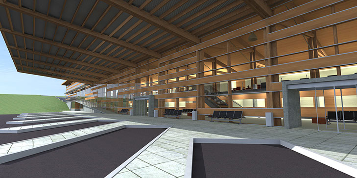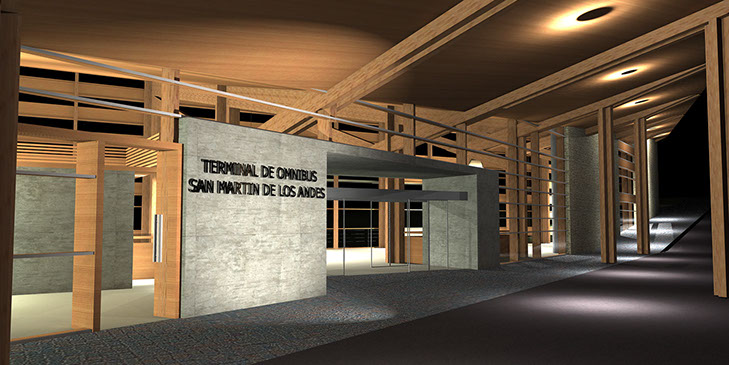 se resuelve con una estructura de madera laminada de gran porte, y grandes superficies vidriadas en los espacios de movimiento de público, aprovechando las buenas orientaciones