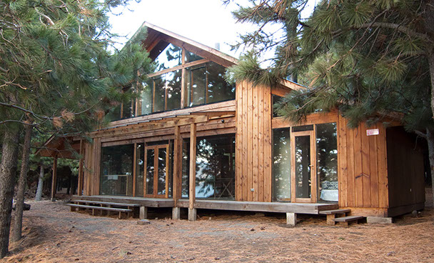 La envolvente (paredes, techos, entrepisos y aberturas) fue preconstruida totalmente en estructura de madera y montada en obra sobre pilotes de hormigón premoldeados.