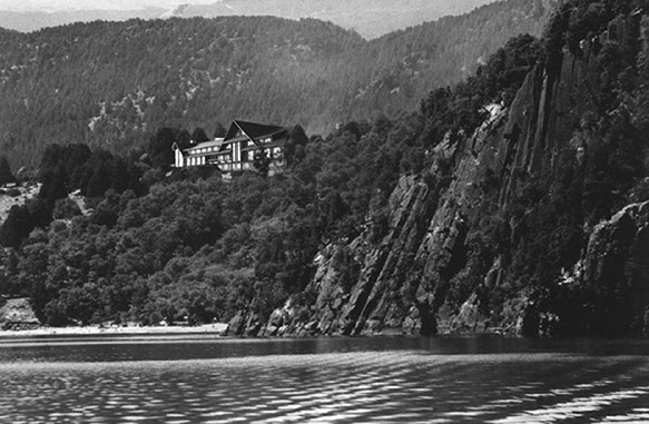 El edificio se sitúa sobre una elevación desde la que se domina el lago en toda su extensión y la cordillera argentina y chilena.