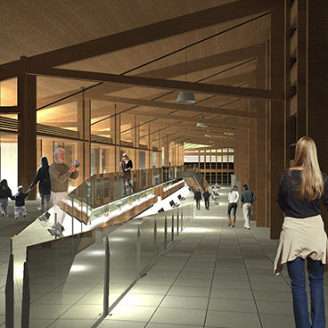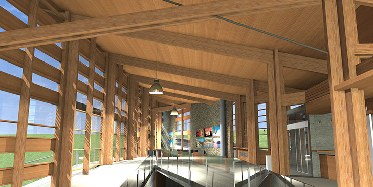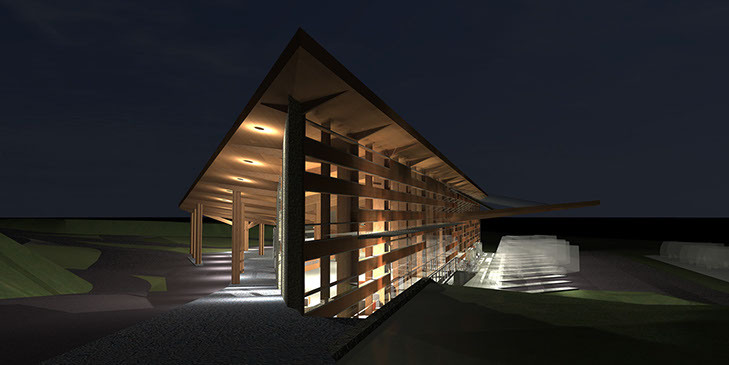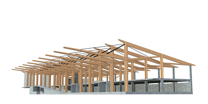 se resuelve con una estructura de madera laminada de gran porte, y grandes superficies vidriadas en los espacios de movimiento de público, aprovechando las buenas orientaciones